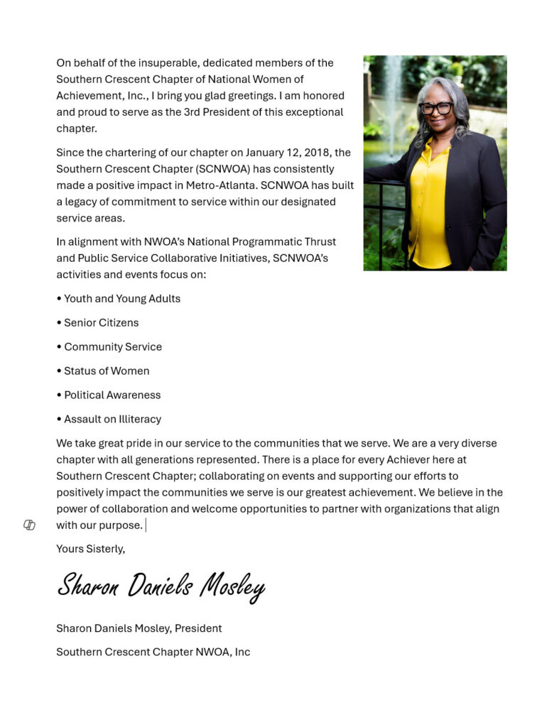 The mission of National Women Of Achievement, Incorporated is to be a proven community-conscious, service-oriented catalyst, and through its multi-faceted programs and projects, shall impact the status of women, empower youth to achieve excellence, enhance the lives of senior citizens, encourage political awareness and improve the conditions found in its various communities.
